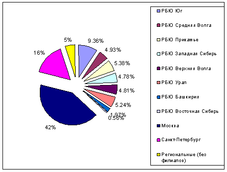 Распределение объема продаж между столицами и регионами по 2008 году: