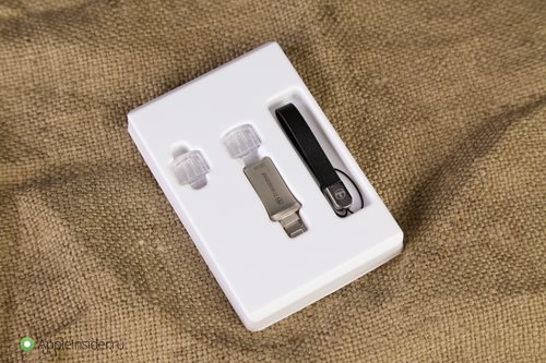 Как мы уже говорили, накопитель оснащен сразу двумя интерфейсами: Lightning и USB 3.1. В комплекте с ним идут две насадки, которые надежно защищают оба разъема от пыли. Еще и ремешку для удобной «транспортировки» место нашлось.