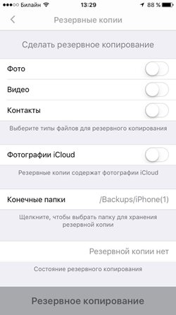 Резервное копирование заслуживает отдельного внимания. Можно выбрать отдельный бэкап фотографий или видео, а также фото iCloud и контактов.