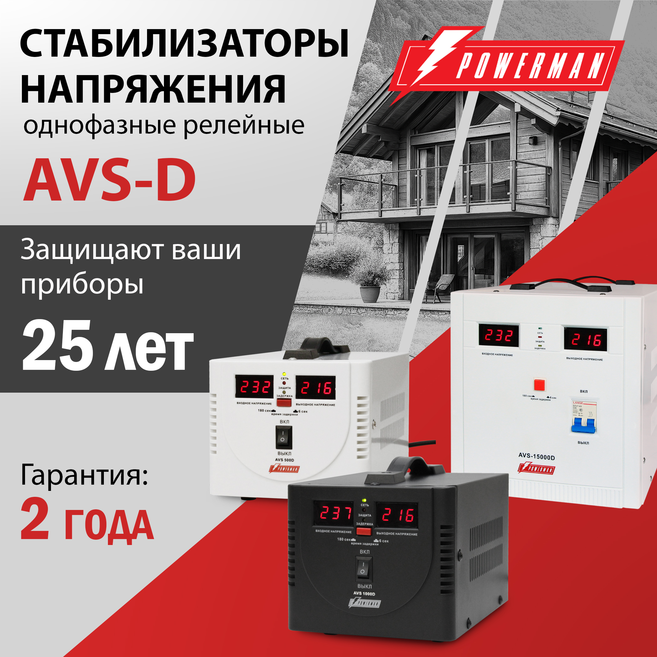 Компания POWERMAN представляет линейку однофазных релейных стабилизаторов напряжения POWERMAN AVS-D, мощность моделей 500-20 000 ВА.